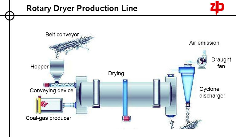 Rotary Dryer Production Line is widely applied in building materials making industry, metallurgical plant, chemical factory, and cement production industry for drying slag, limestone, coal powder, clay, and other materials.